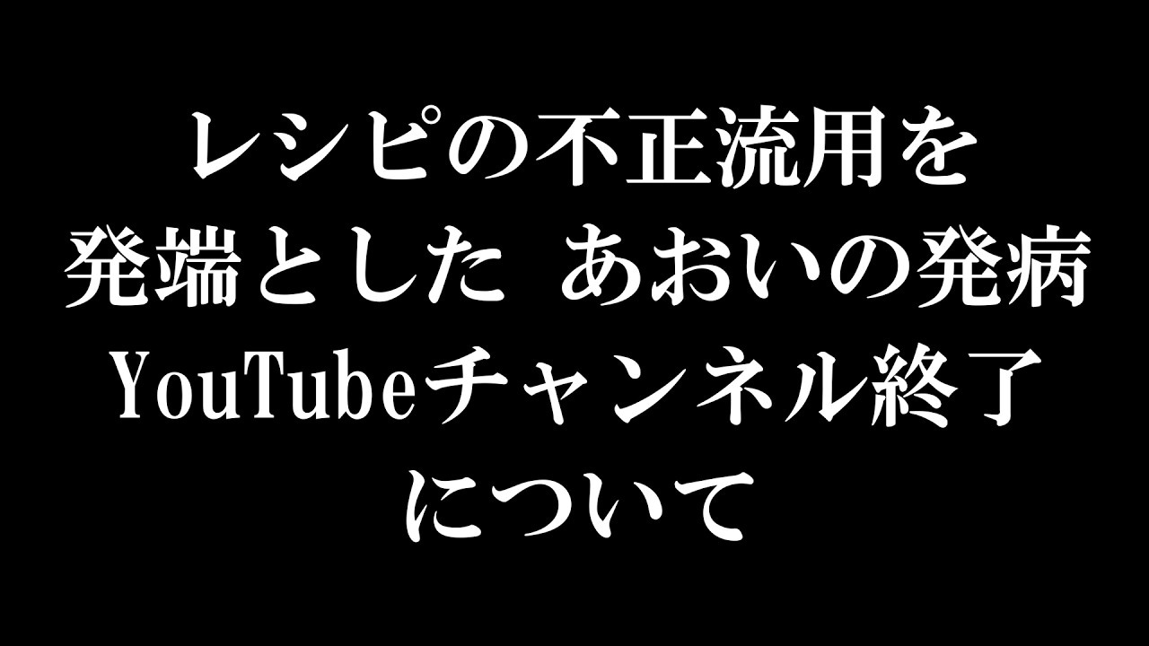 3月5日に公開された「レシピの不正流用を発端とした あおいの発病、YouTubeチャンネルの終了について」に、あおいの夫「けんたろう」が一人で登場。「とても残念なお知らせをしなければならなくなりました」「レシピの不正流用を発端として、あおいが病気になってしまい、このYouTubeチャンネル『あおいの給食室』を終了せざるを得なくなった」と説明しました。