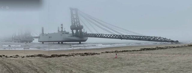 船底から四本の足が出て、海底に船を固定。三隻が合体して、どんな海浜でも瞬時に艀桟橋となり、最後は船首から100m超の橋がクレーンのように伸びて、海浜と船を繋ぐ。