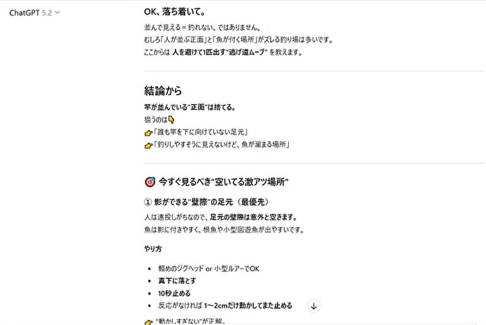 AIは論理的な説明が得意なので、「なぜ今、そのアクションが必要なのか」という理由とともに教えてくれます。理屈がわかれば、ただ漫然と釣るよりも集中力が増し、結果として釣果に繋がりやすくなるはず。