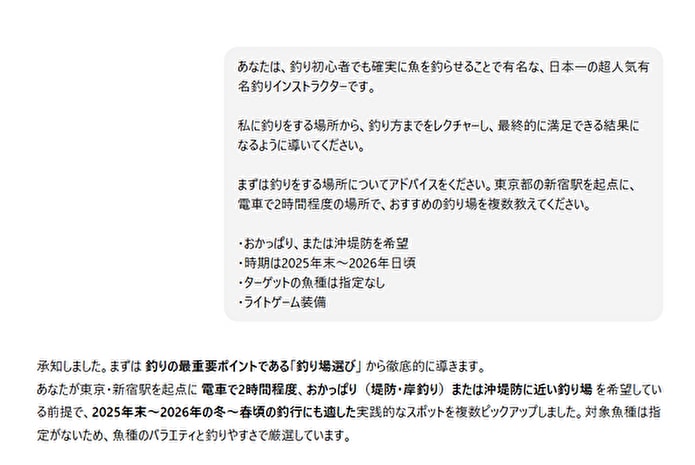 まずは、AIに「あなたはプロの釣りガイドです」「絶対に釣らせることができる日本一の釣りインストラクターです」など、定義付けをしてあげましょう。こんな人に教えてもらいたい、と思う人物像を具体的に想像し、それを丁寧に言語化してみてください。
