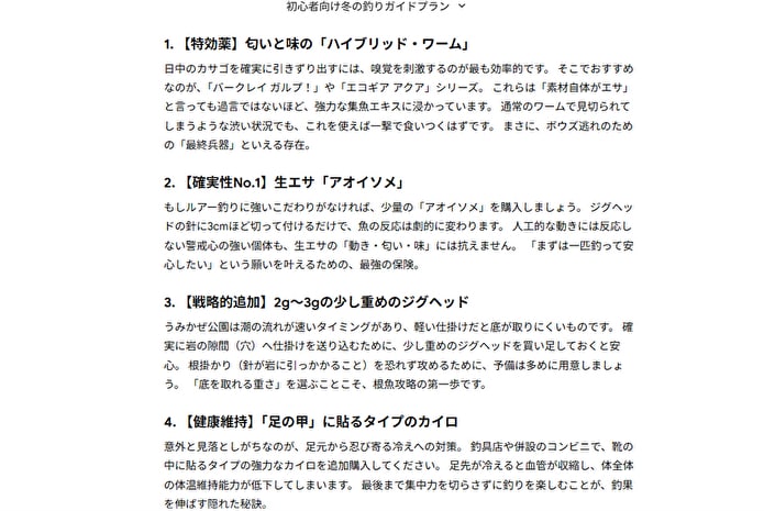 条件が具体的であればあるほど、AIは膨大なデータの中からあなたに最適なプランを絞り込めます。 まずは、とにかく前提条件を細かく指定するところから始めてください。 この作業を丁寧に行うことで、AI釣りガイドの精度を爆上げできるはずです!