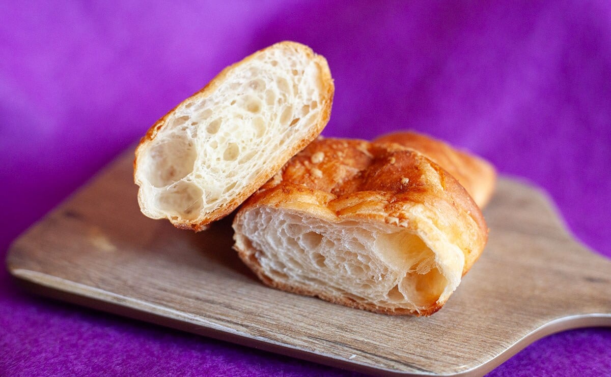 フランスパン生地とデニッシュ生地が組み合わさっているから、「ふわふわ」というよりも、「わしゃわしゃ」とした独特な食感です。焼けたチーズのところは、「カリカリ」を期待しましたが、さすがに難しかった?