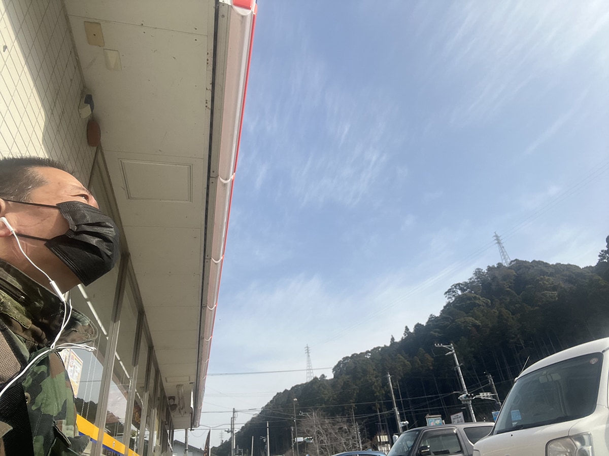 堤防沿いの道を降りて、コンビニ前で一服。