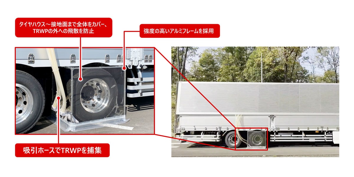 そして大型タイヤにも対応可能な吸引装置、吸引口を開発。風の影響を受けやすいカバー部分には強度の高いアルミフレームを採用。この捕集装置を活用し、走行時に発生する「タイヤ・路面摩耗粉じん」を捕集する手法だ。