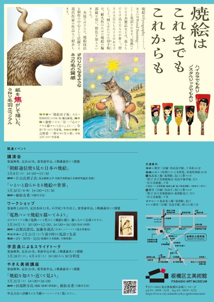 熱した鉄筆やこてなどを紙や絹に押し当てることで、絵や文字を描く「焼絵」。この希少な技法で描かれた作品を鑑賞できる「焼絵 茶色の珍事」が、東京の板橋区立美術館で4月12日(日)まで開かれている。