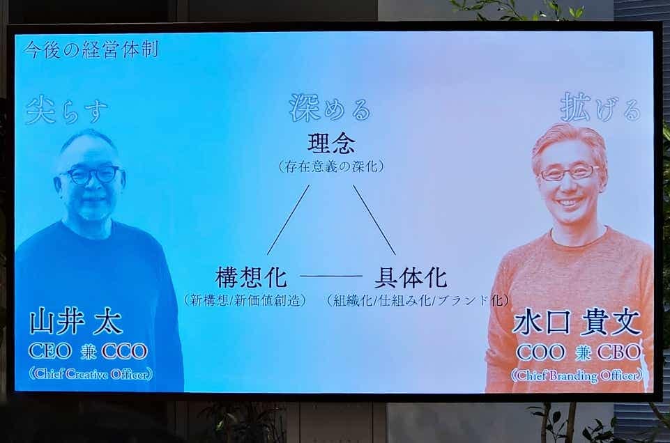 これまで社長を務めてきた山井太氏は、今後はCCO(チーフクリエイティブオフィサー)として「0から1を生み出す構想」を担当。