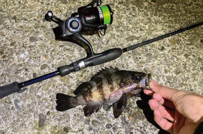 常夜灯まわりに小型のメバルが群れていたので、ちょい投げで狙ってみると簡単にヒット。