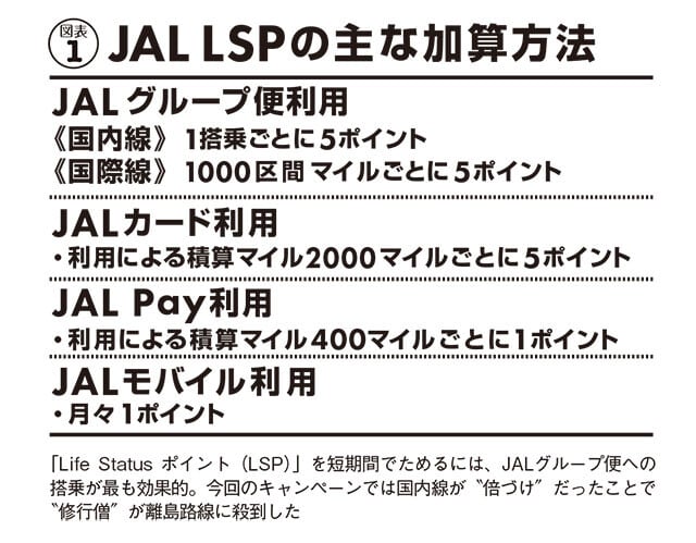「今回の修行僧たちの目的は、マイルとは別に搭乗実績で得られる『ステイタス(優遇資格)』です。現在、JALの制度は生涯実績の『Life Status プログラム(LSP)』(図表①)と、1年ごとの実績で決まる『FLY ON プログラム(FOP)』の2本立てですが、多良間便はその両方の獲得に極めて好都合なのです」