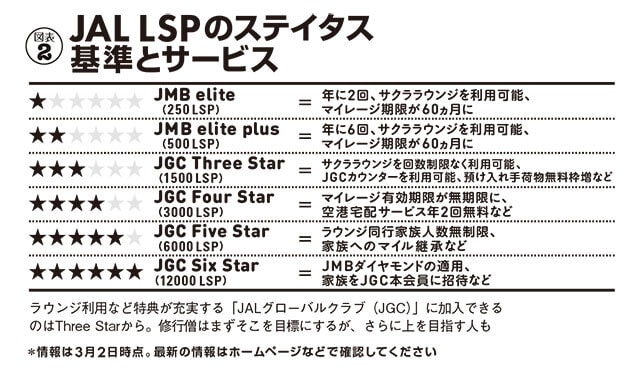 「まずLSPは、累計1500ポイントでJALグローバルクラブ(JGC)に加入できる永続的な優遇が得られます(図表②)。通常、国内線1搭乗は5ポイントですが、2月はキャンペーンで搭乗ポイントを倍の10ポイントに引き上げました(2月末で終了)。