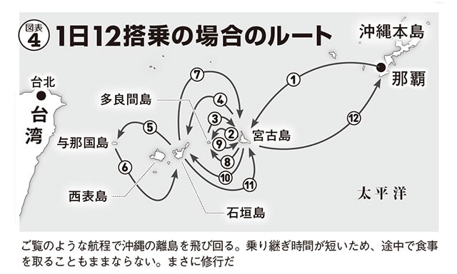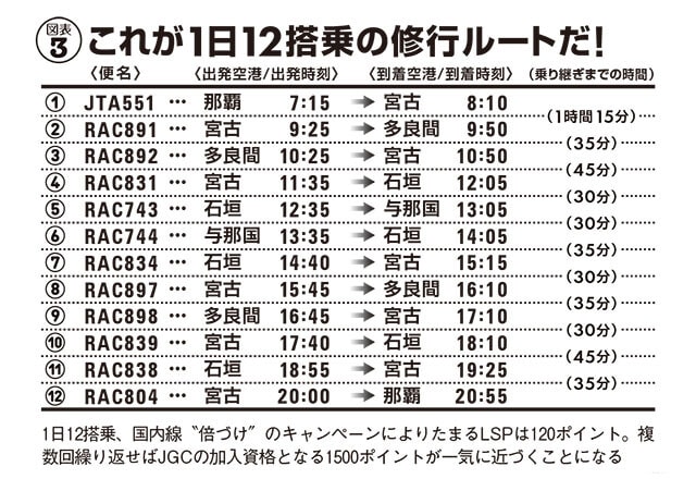 つまり、空港の外へ一歩も出ず、一度降りた後再び同じ機体に乗り続けるだけで実績が爆発的に積み上がる。例えば那覇を起点に島々を巡れば1日12回もの搭乗が可能(図表③④)で、一気に120ポイントを稼げます。これは年間120回搭乗で最高峰ランクとなる『FLY ON プログラム』の回数稼ぎとしても、驚異的な効率です。