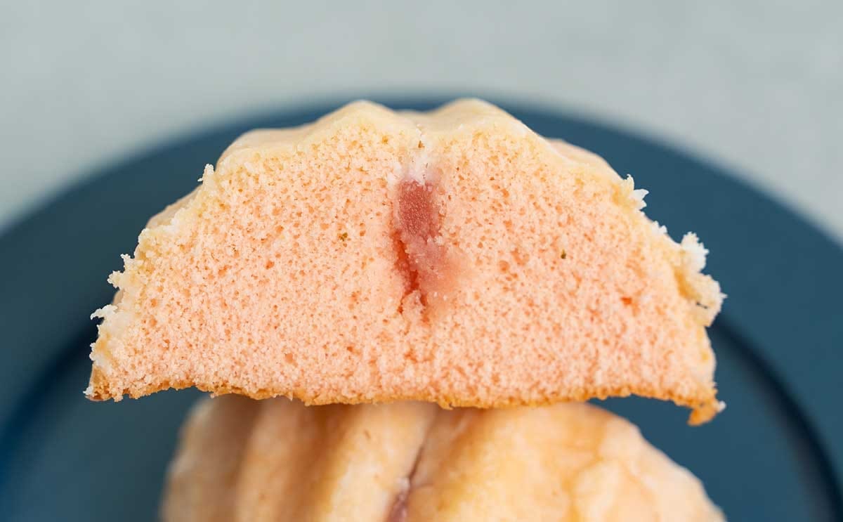 ケーキ生地はふんわり&しっとりとした口当たりで、グレーズのシャリシャリとした食感がよいアクセントになっています。生地とグレーズだけでも桜の風味を楽しめますが、中央の餡を食べると、桜の風味が増しておいしい! 桜葉入りで香りのよい餡は、“和”を感じる上品な味わいですね。