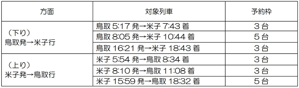 2026年度の「鳥取うみなみサイクルトレイン」は、4月4日(土)から通年で土休日1日3往復運行します。山陰本線の鳥取駅〜米子駅間が対象で、鳥取大学前駅・東山公園駅を除く22駅で利用可能です。ただし、12月〜2月の期間や、多くのお客様の利用が見込まれる日および列車においては対象外となります。