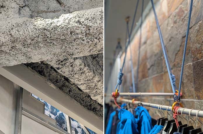 天井には本物の岩、ロープを使った什器。さらに実際のフィールドで建てられている山小屋と同じように、自然環境に強いとされる、木とメタルの組み合わせになっているなど、こだわりが随所に詰まった店内。