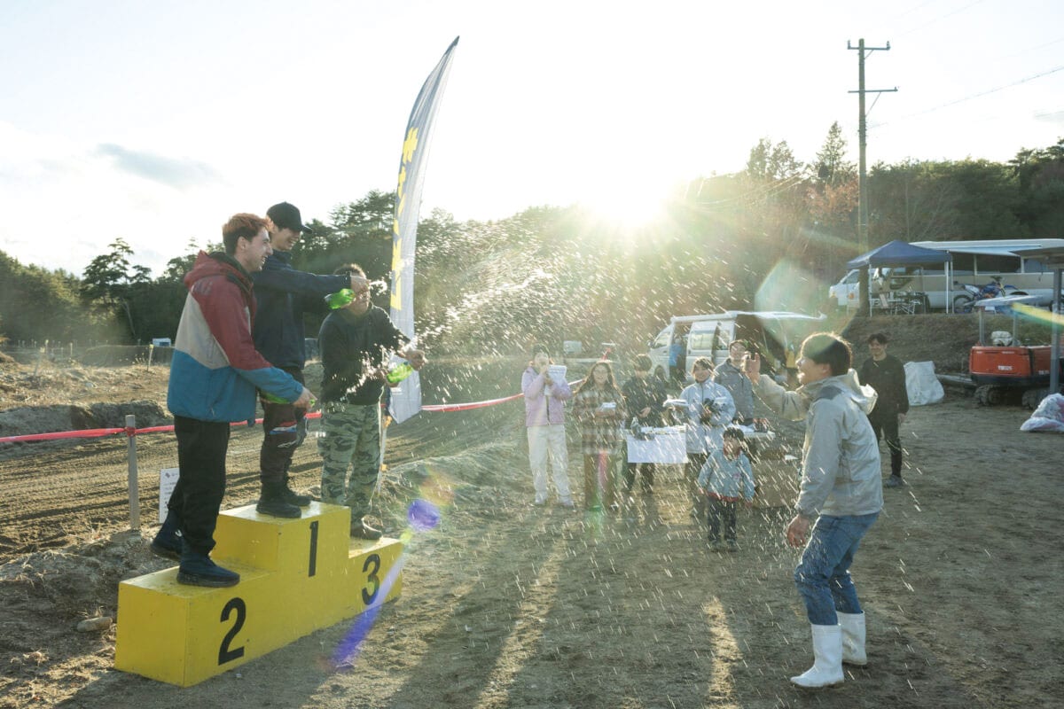 リザルトの集計が終わったら表彰式が始まります。各クラス1〜3位が表彰され、副賞とともにシャンパン(炭酸水?)でシャンパンファイト。
