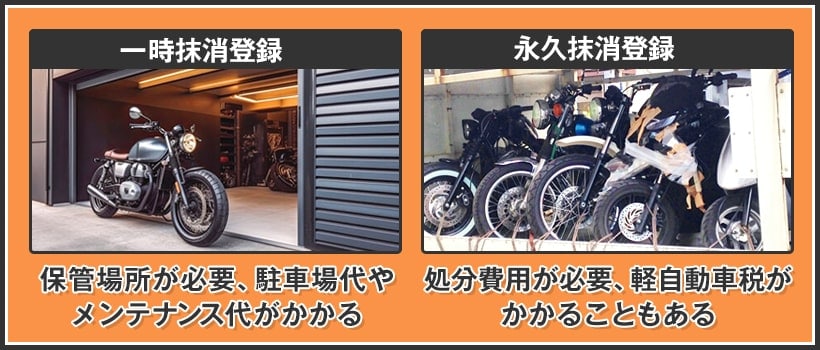 また、永久抹消登録はバイクを解体処分するため処分費用がかかる上、解体が年度をまたいで4月1日以降になる場合、軽自動車税が課税される恐れがあります。