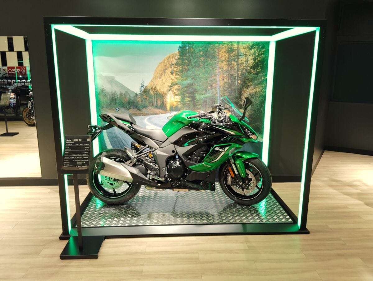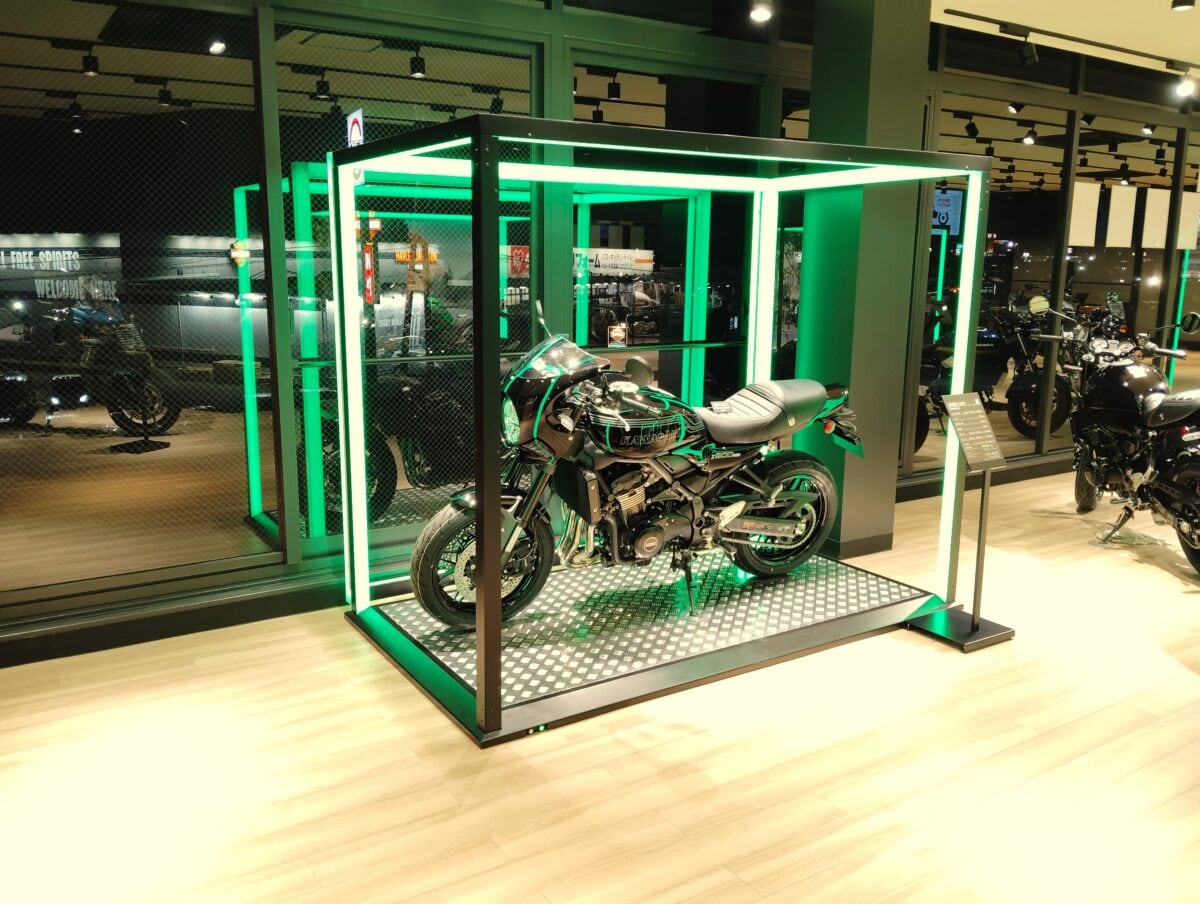 新たなオーナーを待つモーターサイクルたちが、ケージの中で静かに眠りについているイメージを光の枠で創出。カワサキプラザならではのアイコニックポイントの一つです。