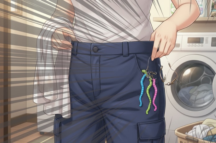 ティッシュまみれでさえ怒られるのに、家族にワームと一緒に洗濯機を回したなんてバレたら……(怖)