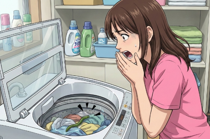 洗濯が終わった合図とともに、意気揚々とふたを開けた瞬間、洗濯槽の縁に芋虫が乗っている!? と思ったらワーム。