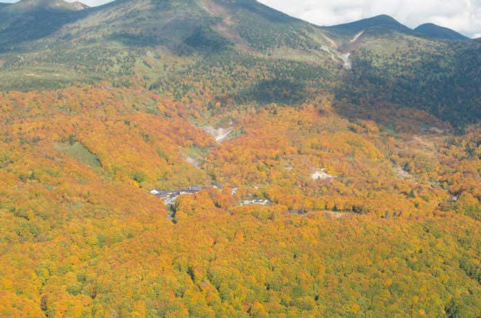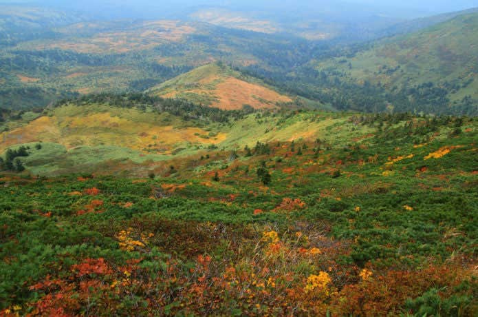 八甲田山は裾野の酸ヶ湯温泉から紅葉が広がります。ハクサンシャクナゲ、アカミノイヌツゲなどの低木のほか、ブナ、ナラ、カエデ、ダケカンバなど色とりどり。