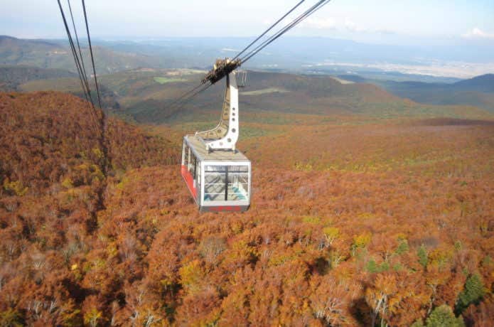 八甲田ロープウェイは山麓駅から山頂駅まで高低差650mを一気に登ります。窓の外に見える景色が壮観で、秋は紅葉に染まる山腹が眼下に広がり、まるで空中を散歩しているかのよう!