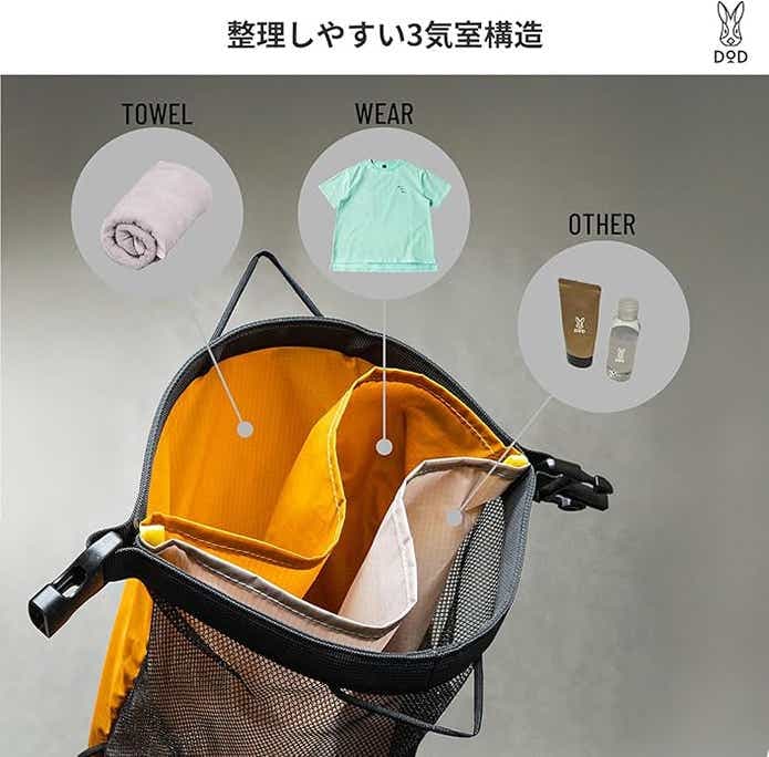 「キャンプ・温泉・ジムにめちゃいいぞコレ」DODの新製品“3分割バッグ”で着替え類もスッキリ収納!