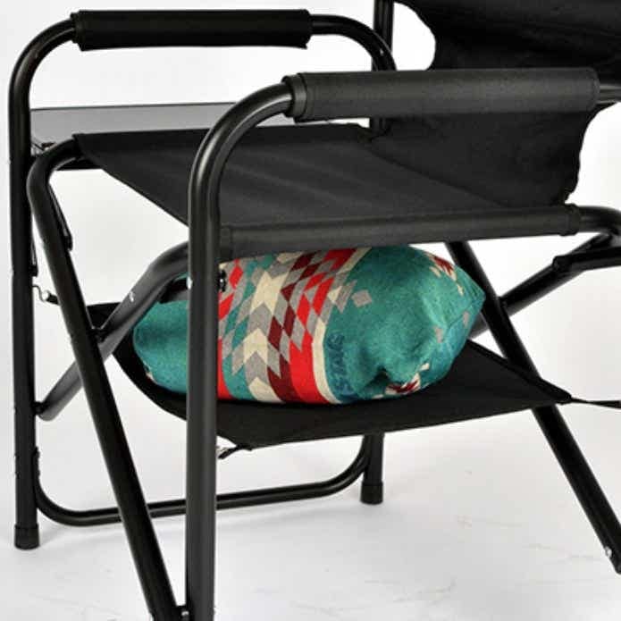 「棚モック付きアルミディレクターチェア<サイドテーブル付>」最大の特徴は、サイドと座面下に備えた、サイドテーブルと収納スペースです。