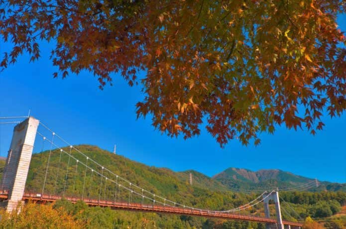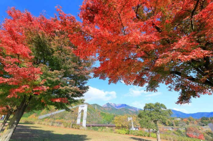 敷地内には子ども広場や自然観察の森、バーベキュー場などがあり、家族連れやグループでも◎。公園のランドマークである「風のつり橋」からは、美しく色づいた丹沢の紅葉を見渡すことができます。