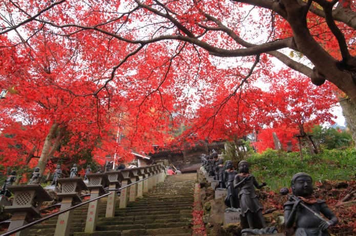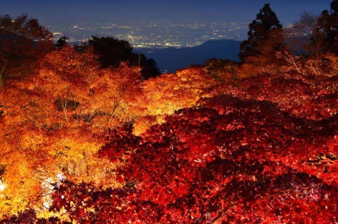 ケーブルカーに乗車し、「大山寺駅」で下車すれば、真っ赤な紅葉に彩られた参道を散策することができます。厳かな雰囲気漂う夜のライトアップも人気。