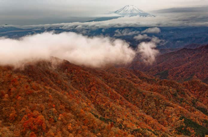 丹沢山の魅力といえば、なんといっても展望の良さ。長~い尾根歩きの末に、絶景の山頂にたどり着きます。遠くにそびえる富士山と眼下に広がる紅葉の山々との壮大なコラボレーションは圧巻。