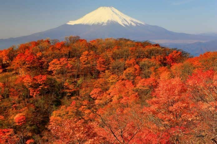 山頂からは富士山と紅葉のコラボレーションを一望。紅葉のピークは11月中旬です。