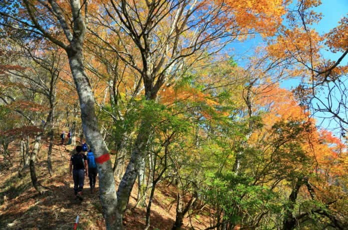 定番の大倉コースは、標高差約1,300m!ひたすら同じような尾根登りが繰り返されることから「バカ尾根」とも言われています。10月中旬に山頂から色づき始めた紅葉は、11月中旬ごろにピークを迎えます。