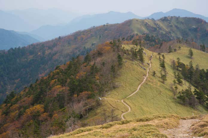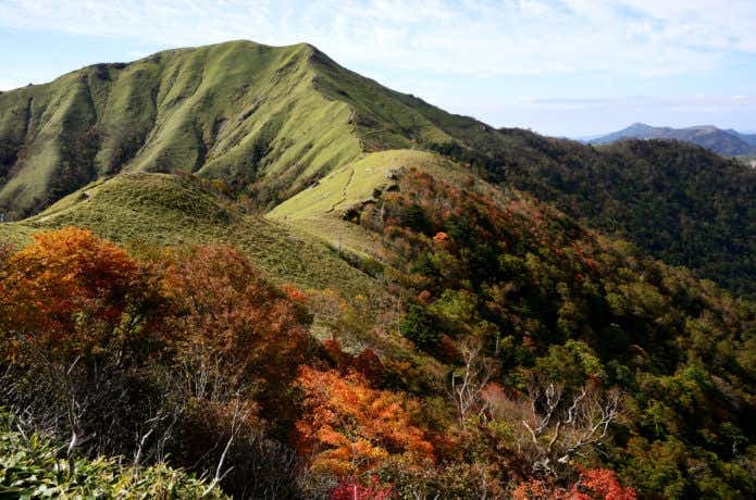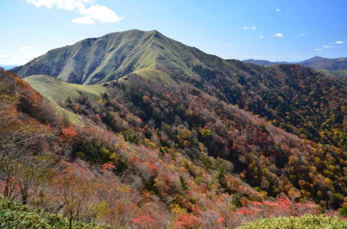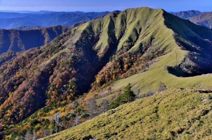 山頂からは隣にそびえる次郎笈や次郎笈へ延びる美しい稜線もばっちり見渡せます。稜線付近は草原のように開け、山腹から赤や橙に染まる木々が広がっていっているのが目にできるでしょう。さらに、周囲の四国山地の山々全体が美しい紅葉に覆われている姿も視界に収められ、息を呑むほどの絶景が堪能できますよ!