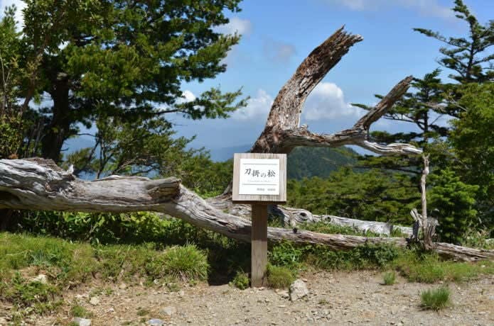 西島駅から山頂まで最短で行ける尾根道コース上に刀掛けの松があります。今回紹介するコースでは、下山に立ち寄ることになりますが、登りで刀掛けの松を経由して大剣神社へ向かうこともできます。