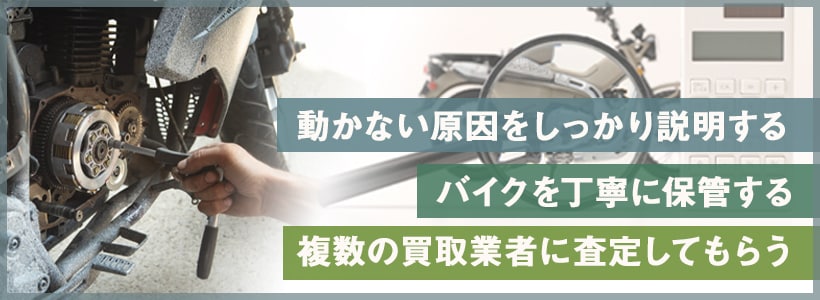 買取業者に査定をしてもらうときは、動かない期間や原因、保管方法などをきちんと伝えましょう。バイクの劣化が進まないよう、保管方法に気を配ることも必要です。不動バイクを早めに業者に持ち込むと、劣化が進まない状態で持ち込めるため、買取金額が高くなるケースもあります。