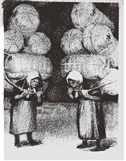 どう見ても、力いっぱい力んで持ったり運んだりしているようには見えません。骨格の上にしっかり乗っているという感じです。この女性たちが力自慢のボディビルダーのように筋力があったわけではなく、効率のいい体使いができたからこのようなことができたのでしょう。残念ながらその写真を本書ではお見せできず、写真をもとにイラストを描いて頂きました(下図)。そこはお詫び申し上げます。