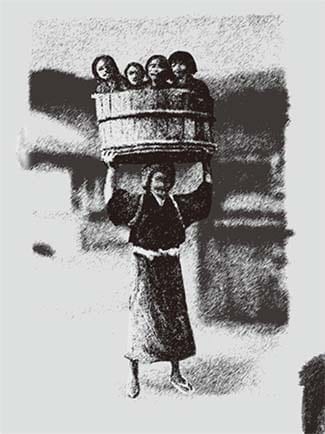 その写真を見て、私は驚愕(きょうがく)させられたものです。大きなたらい桶に4人の子供を乗せ、それを頭の上に乗せて運んでいる女性が写っていました。