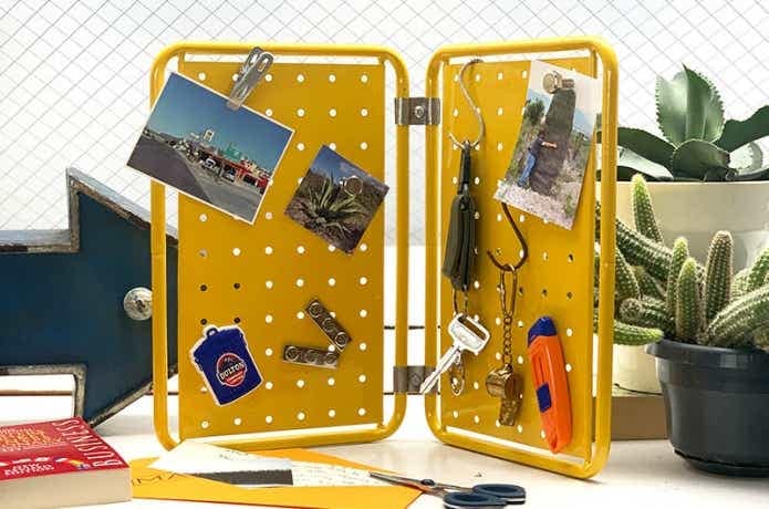 ガレージや玄関に置きやすい卓上サイズのペグボード。アクセサリーや鍵などの整理に便利です。スチール製のため磁石も使え、アイデア次第でさまざまな使い方ができます。