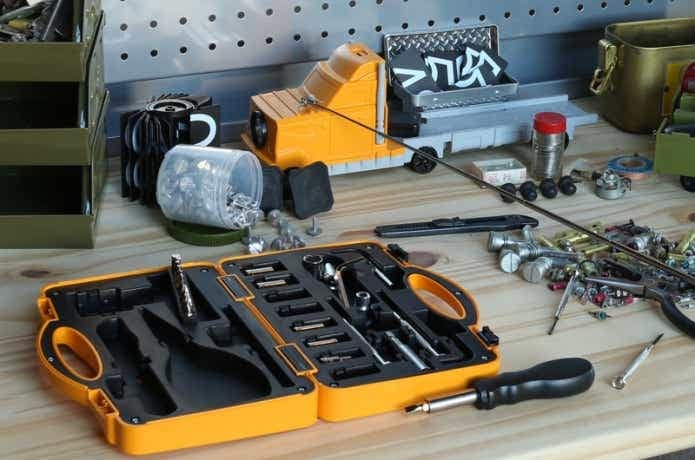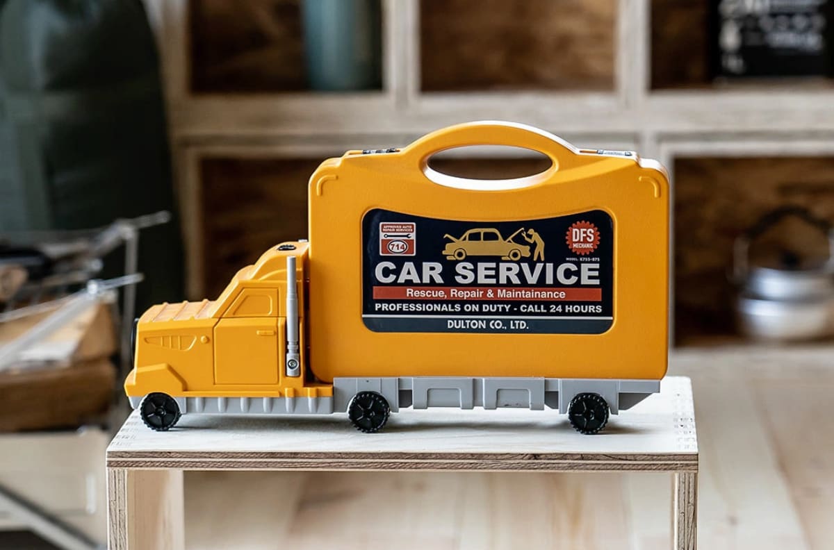アメリカンな雰囲気漂う車型のツールキット。荷台を開くと、ドライバーや六角レンチ、カッター、ドライバービット、ソケットなど本格的な工具がそろっています。スイッチを押すとヘッドライトが点灯する、ユニークなギミックも魅力です。