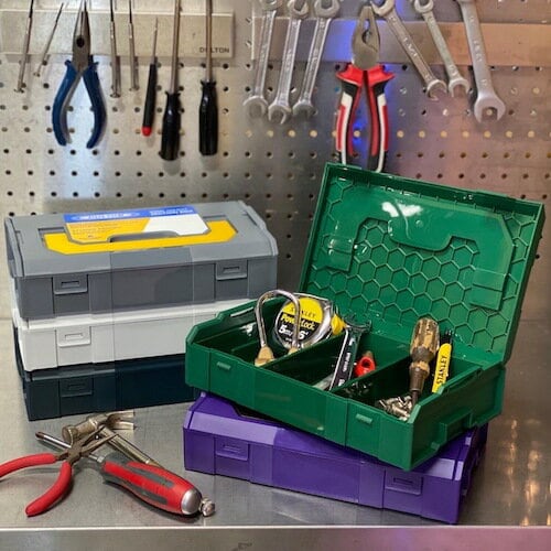 本体と持ち手の配色が目を引く収納ボックス。スタッキングしたまま持ち運びが出来る連結式なので、複数使いがおすすめ。中の仕切りは取り外しが可能で、工具入れとしてはもちろん釣りやキャンプでの小物入れにも便利。