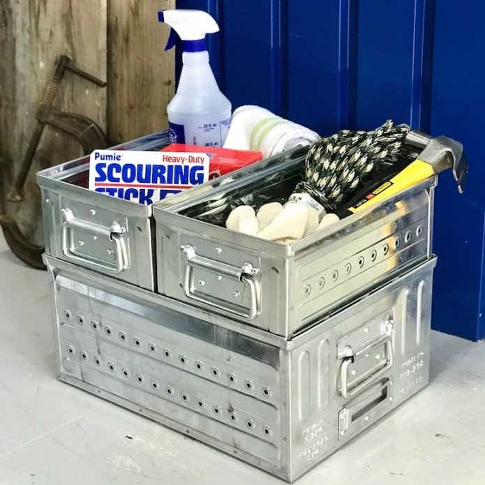 スチール製のタフで無骨なスタッキングコンテナ。サイズ違い同士で重ねて使えるため、収納スペースを効率よく活用できます。6Lとコンパクトなサイズ感で、小物の整理や細かなギアの収納にも便利です。