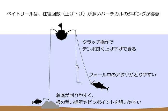 また、クラッチ操作でメタルジグを素早く落とせたり、フォール中のアタリに気付きやすかったりするのもベイトタックルのメリットです。