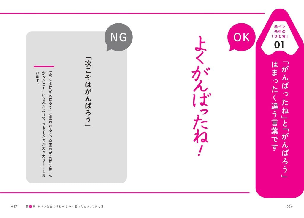 この本では、57年間受け継がれてきた「赤ペン先生」のほめノウハウをもとに、日常生活ですぐに使える「声のかけ方」を紹介。「チャレンジして失敗したら」「努力して成果が出たら」「めんどくさいと言われたら」など、具体的なケースを通じて、子どもの自信とやる気を引き出す「ひと言」を伝えてくれる。