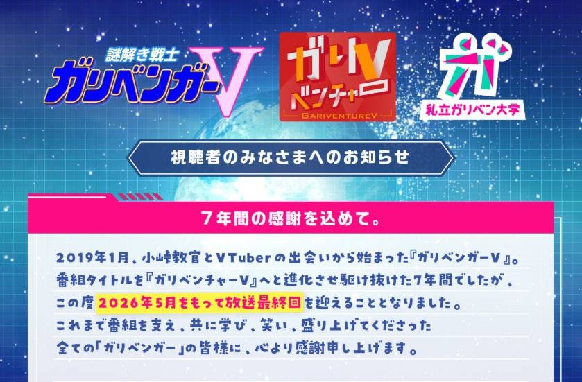 バラエティ番組「ガリベンチャーV」(テレビ朝日系)が、2026年5月の放送回をもって最終回を迎えることがわかりました。番組公式Xが3月11日に発表したもので、2019年1月の放送開始から約7年にわたる歴史に幕を下ろします。