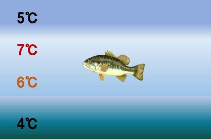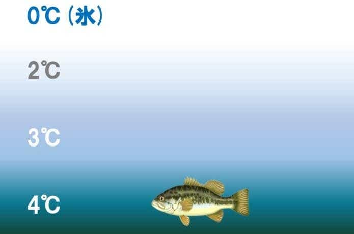 変温動物であるバス。外気温(水温)で自身の体温も変化してしまうバスが、なぜ、凍るほど冷たい水の中で生きることができるのでしょうか? その秘密は水の持つ性質(サーモークライン)にありました。