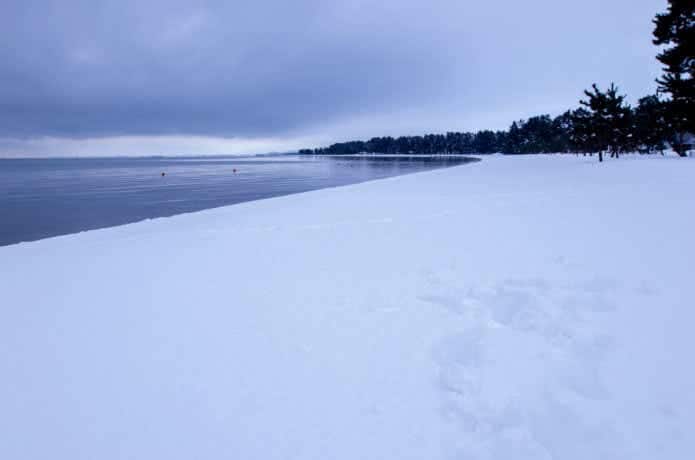 外気温で水が冷やされ0℃になると水は凍りますが、氷になった水は密度が著しく低くなるため、湖の表面に氷が張ります。