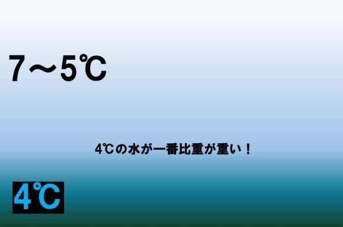 4℃が最高密度となり、そこから水温が高くなるにつれて密度は低くなります。反対に4℃よりも水温が下がっても密度は低くなります。