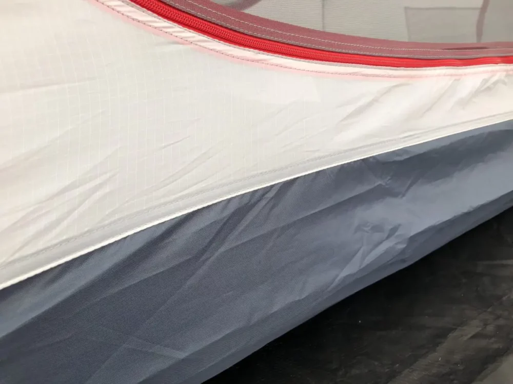 この部分、市場に出回っている多くのテントでは、耐水圧1500~2500mmというものが多いのですが、このラフツーリングテントは耐水圧4000mmを確保。ザックリいうと「雨に強くてなおかつ涼しい快適テント」なわけです♪