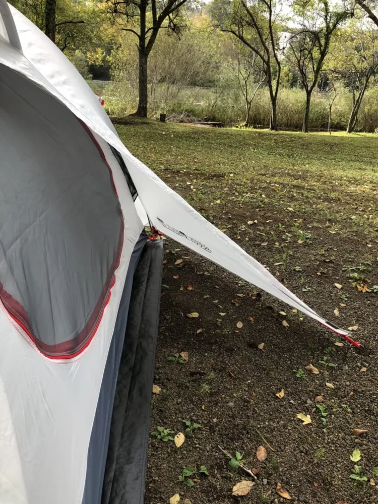 こだわりは室内側にもたくさんあります。まずは奥行き80cmの前室が前後にあり、RR5956のグランドシートを使うと片側40cm分が床アリで使用できます。テントに出入りする際、靴の脱ぎ履きに意外と便利なスペースです。