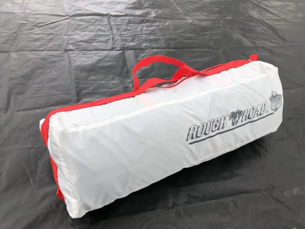 そして次にテントを広げましょう。RR5954 ラフツーリングテント 初回ロットの色はクールグレー×レッド。バイク積載時のサイズにこだわり収納サイズは13×14×50cm。