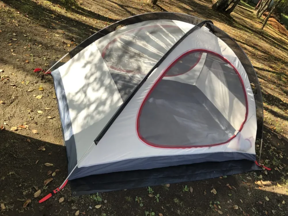 動画でもあった通り、設営方法はいたって簡単で本体に2本のアルミフレームを通してフライを被せ、ペグダウンするだけ。セット重量は2.8kg。